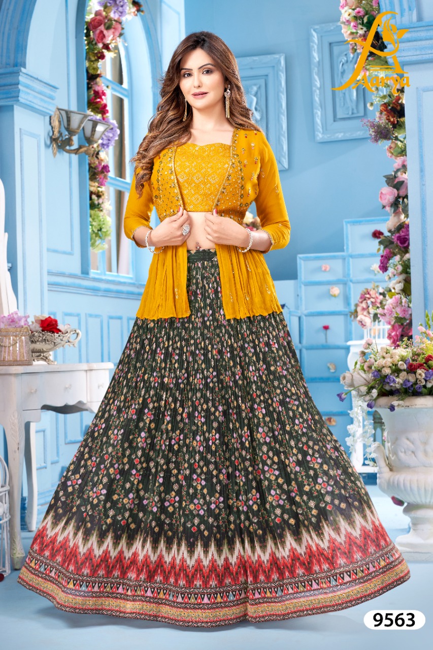 TOSCANA GREEN PRINTED SKIRT WITH SULFUR YELLOW ATTACHED PAPLUM JACKET CROPTOP WITH HAND & LAKHNAVI SEQUENCE WORK.